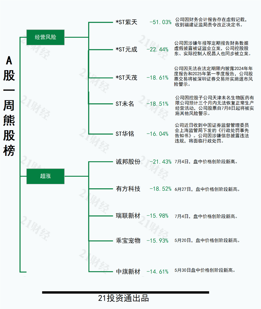 本期十大熊股中(剔除近一周上市的次新股),*ST紫天(300280.SZ)周跌51.03%成为最熊股,*ST元成(603388.SH)、诚邦股份(603316.SH)、*ST天茂(000627.SZ)等跌幅均在20%以上。本周熊股榜10只个股周跌幅均超14%。