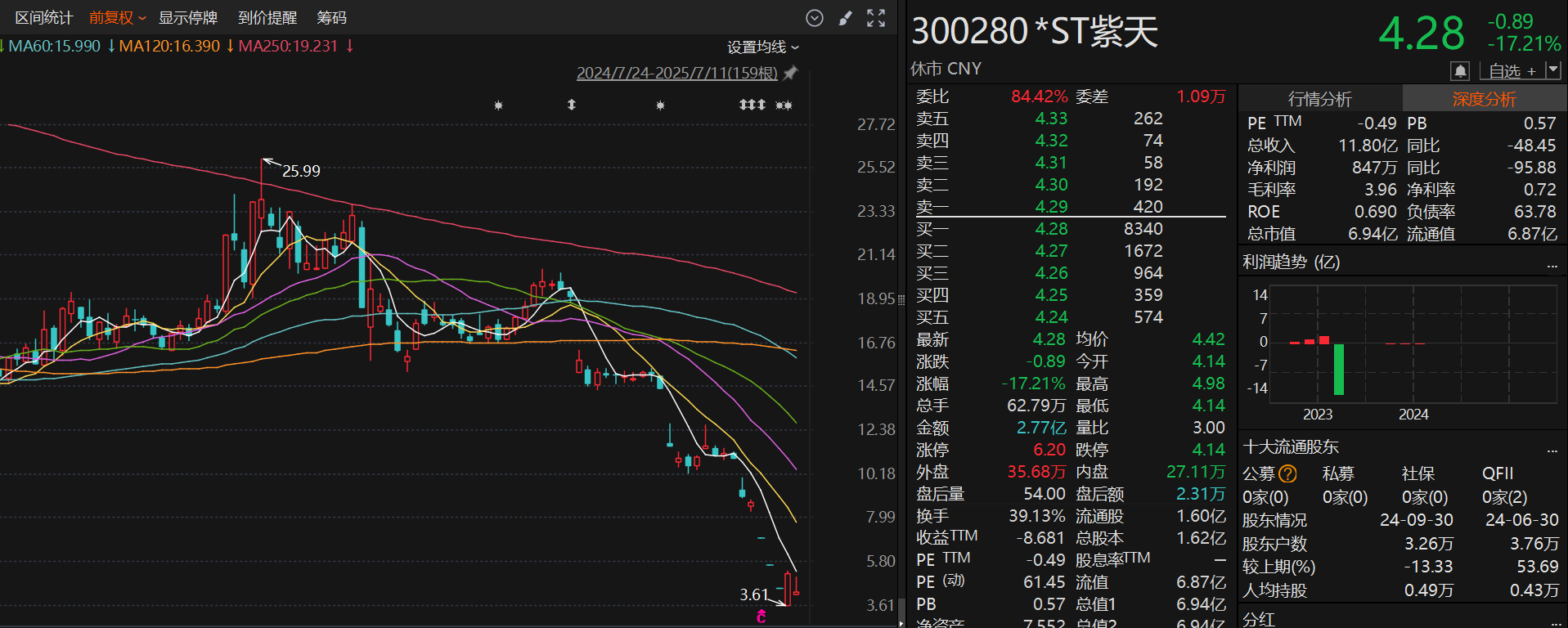 二级市场方面,7月11日,*ST紫天复盘后震荡下跌。