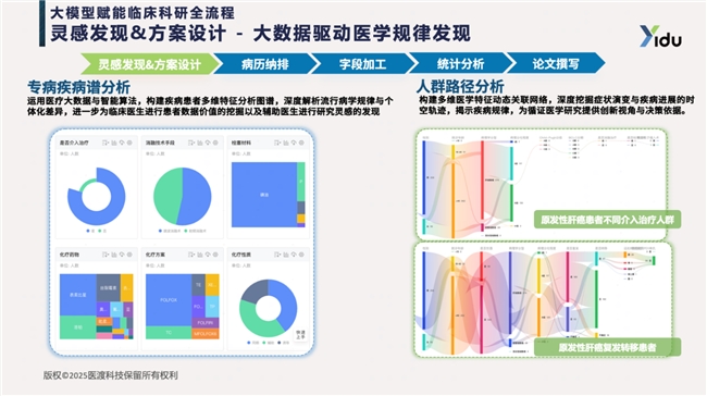在临床科研场景,医渡科技基于专病数据库,通过大模型赋能实现文献驱动的灵感发现、数据驱动的规律挖掘,以及科研全流程自动化——从自然语言检索病例、智能数据加工到统计分析、论文撰写,大幅提升科研效率。