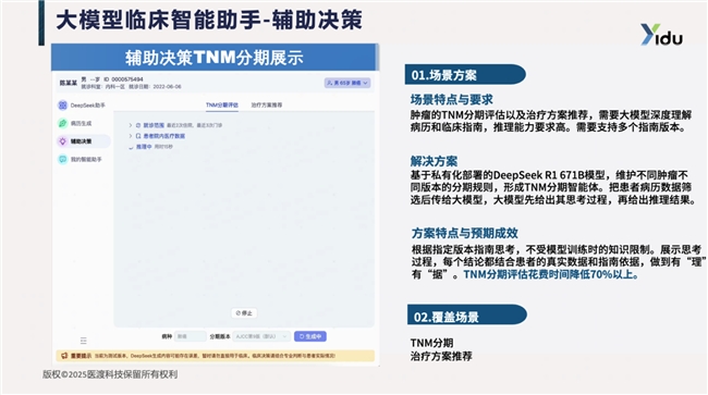 在智慧诊疗场景,医渡科技的大模型临床智能助手已在北京肿瘤医院等机构落地应用,支持病历生成、辅助决策等功能。以TNM 分期评估为例,大模型能结合患者病历数据和最新指南,快速完成评估,将花费时间降低70%以上,且结果稳定可靠。此外,医生还可通过自定义工具,根据自身需求创建专属智能体,满足不同科室、不同场景的个性化需求。