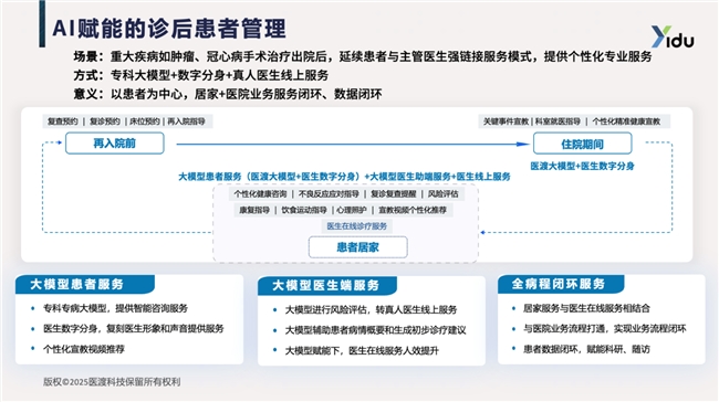 在智慧服务场景,大模型在诊后患者管理场景的应用价值尤为凸显。李林峰介绍,针对肿瘤、冠心病等重大疾病术后患者,医渡科技通过专科大模型结合数字分身技术,为患者提供个性化健康咨询、不良反应应对指导、复诊复查提醒等服务,同时辅助医生生成回复内容,大幅提升了医生工作效率。