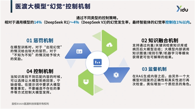 针对大模型幻觉问题,通过模型训练优化、知识融合增强、监督机制完善及工程控制强化等多重手段,将幻觉发生率控制在1%以内,为医疗场景的广泛应用奠定坚实基础。