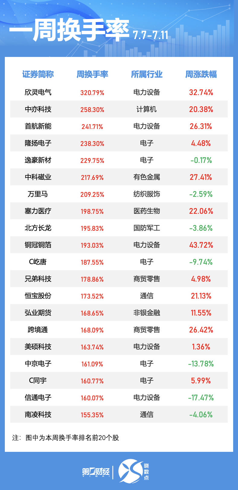 按照申万一级行业分类看,本周换手率100%以上的个股中,所属电力设备、电子、计算机等行业的个股居多。