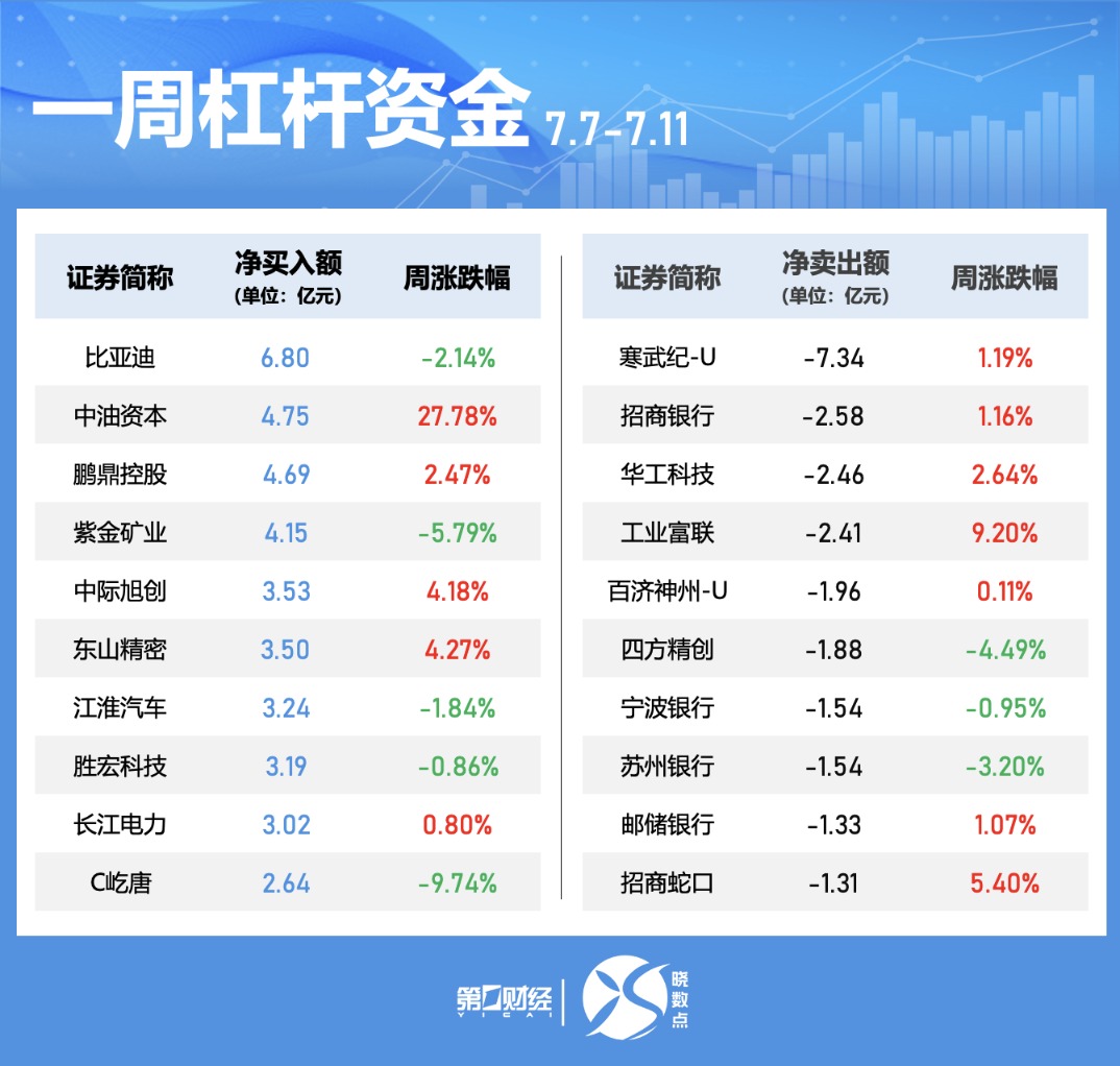 比亚迪本周获融资净买入居首,净买入额为6.8亿元。中油资本、鹏鼎控股、紫金矿业净买入居前,金额均超4亿元;寒武纪-U、招商银行、华工科技遭净卖出额居前,金额分别为7.34亿元、2.58亿元、2.46亿元。